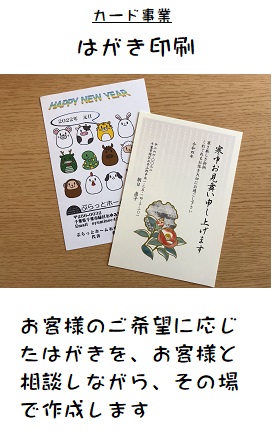 カード事業とは、カード(名刺やはがき)をお客様の目の前で作って提供する、というもの(リアルなオンデマンドシステム)。お客様からの「ありがとう」の言葉を通じて「働いている自分への自信」を感じて頂くことを目的とした事業です。